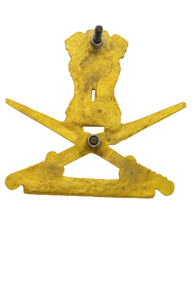 This is a solid brass Indian Army insignia badge featuring the Ashoka emblem above two crossed swords with the text “INDIAN ARMY”. The badge is finely crafted with a polished golden finish and comes with threaded studs and nuts at the back for secure mounting. It is ideal for use on uniforms, turbans, ceremonial displays, or as a collectible item. The sturdy brass construction ensures durability and long-lasting shine, making it perfect for military enthusiasts, collectors, or decorative purposes.