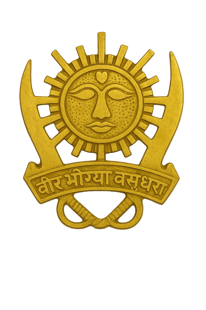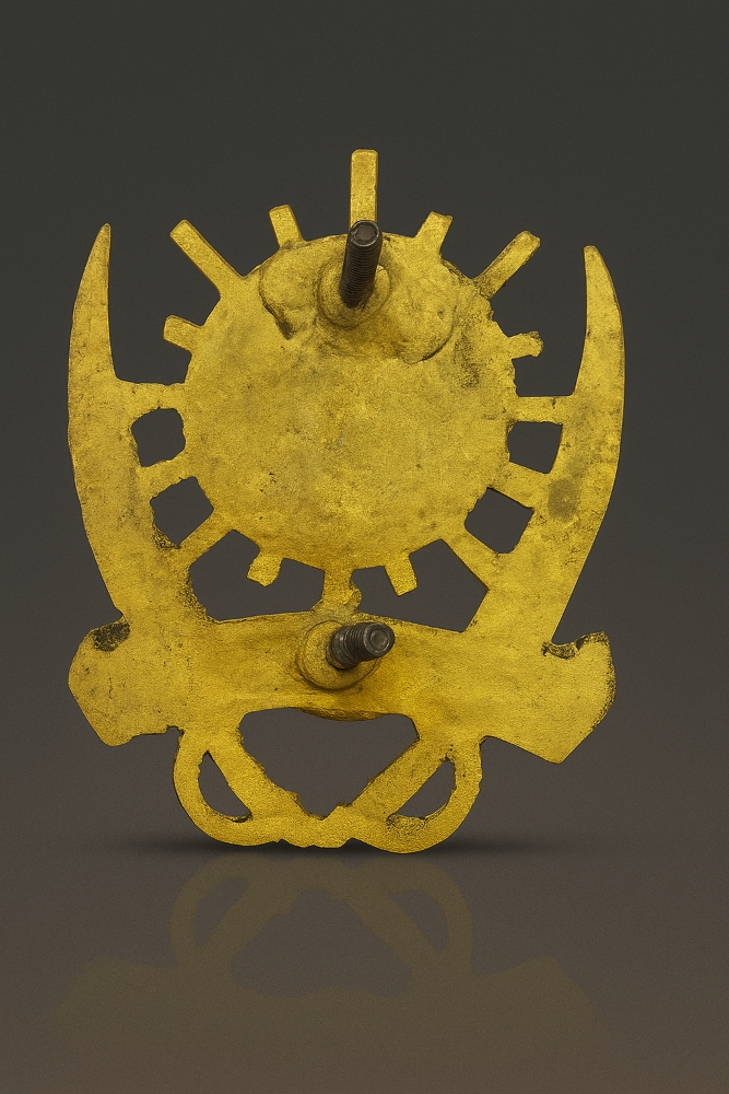 This is a solid brass emblem featuring a traditional design with crossed swords and a radiant sun motif. Crafted from durable brass with a polished golden finish, it is designed for mounting with the attached threaded studs. Commonly used on turbans, uniforms, or ceremonial displays, this emblem adds a touch of heritage and elegance. Its sturdy build ensures long-lasting use, making it ideal for collectors, cultural events, or decorative purposes.