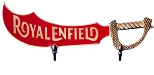 Aesthetics: It features a striking, high-contrast finish: the main body/blade is painted in a bright, glossy red, while the raised lettering, which spells out "ROYAL ENFIELD," is finished in a contrasting golden (brass) color. The ornate handle/hilt is also a textured, golden metal.