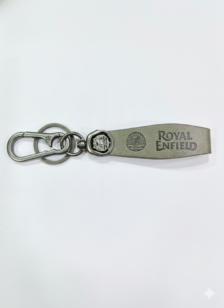 Iconic Branding: A prominent, branded metal badge is securely set on the leather strap, featuring the iconic Royal Enfield logo or seal. The brand name is also embossed directly onto the leather fob.