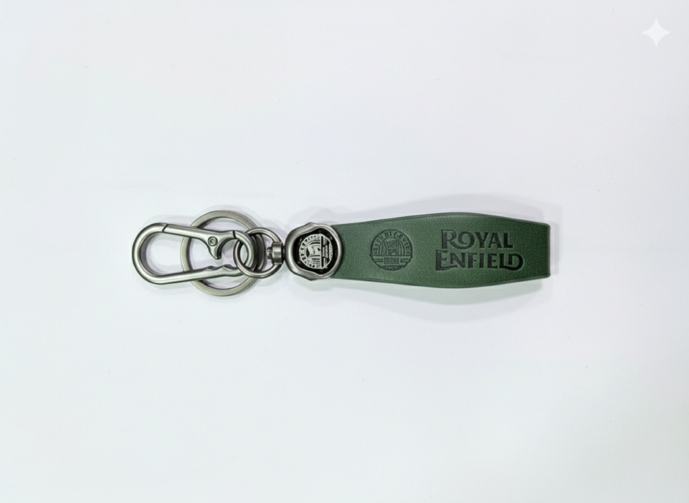 Iconic Branding: A prominent, branded metal badge is securely set on the leather strap, featuring the iconic Royal Enfield logo or seal. The brand name is also embossed directly onto the leather fob.