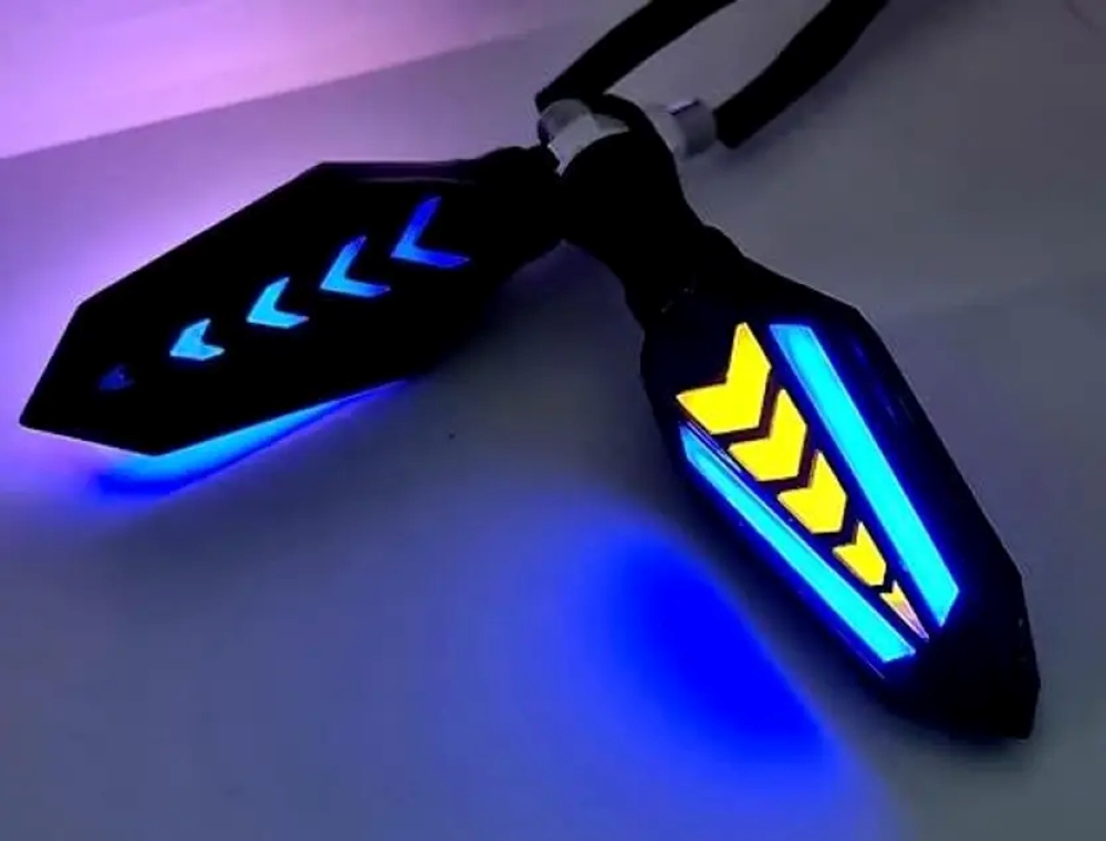 Upgrade your bike's signaling system instantly with this pair of versatile LED lights. The bright Yellow (Amber) light flashes effectively to communicate your turning intentions, while the vibrant Blue light can be wired as a complementary Daytime Running Light (DRL) or an accent light, giving your bike a distinctive appearance.