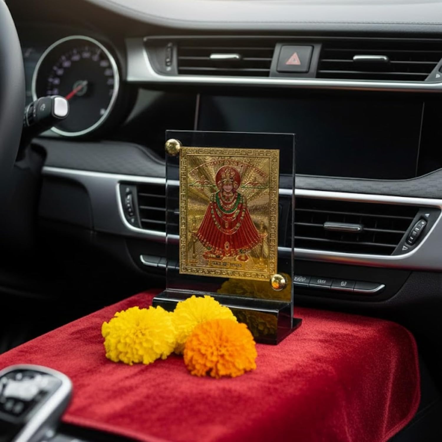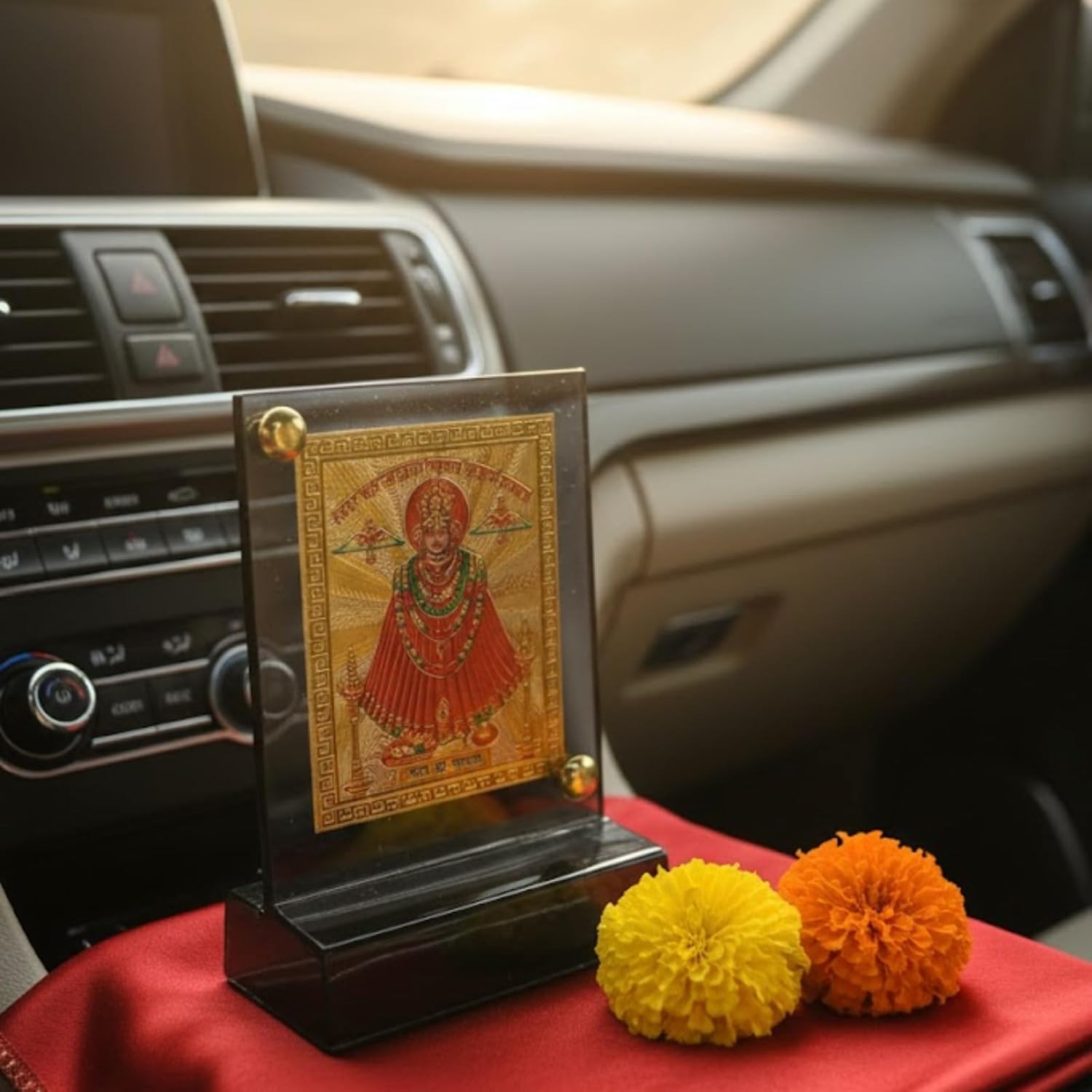 The set includes a goddess idol photo frame mounted on a sturdy acrylic stand that sits securely on your dashboard. The clear acrylic stand adds durability, while the intricately designed frame highlights the image of your chosen deity, bringing positive energy and protection to your rides.