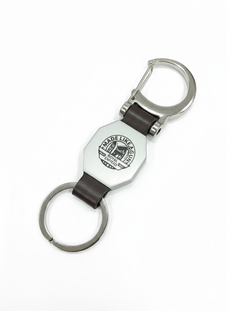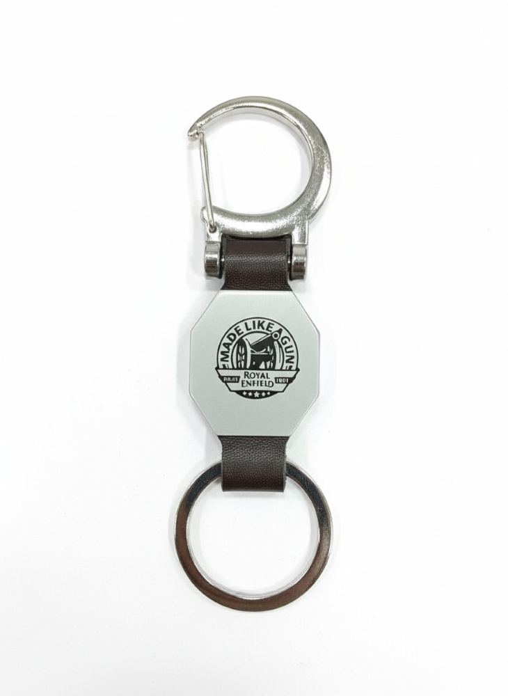 Iconic Motto: Features the bold, deeply engraved motto "MADE LIKE A GUN, SINCE 1901 ROYAL ENFIELD" on a distinctive octagonal metal fob.