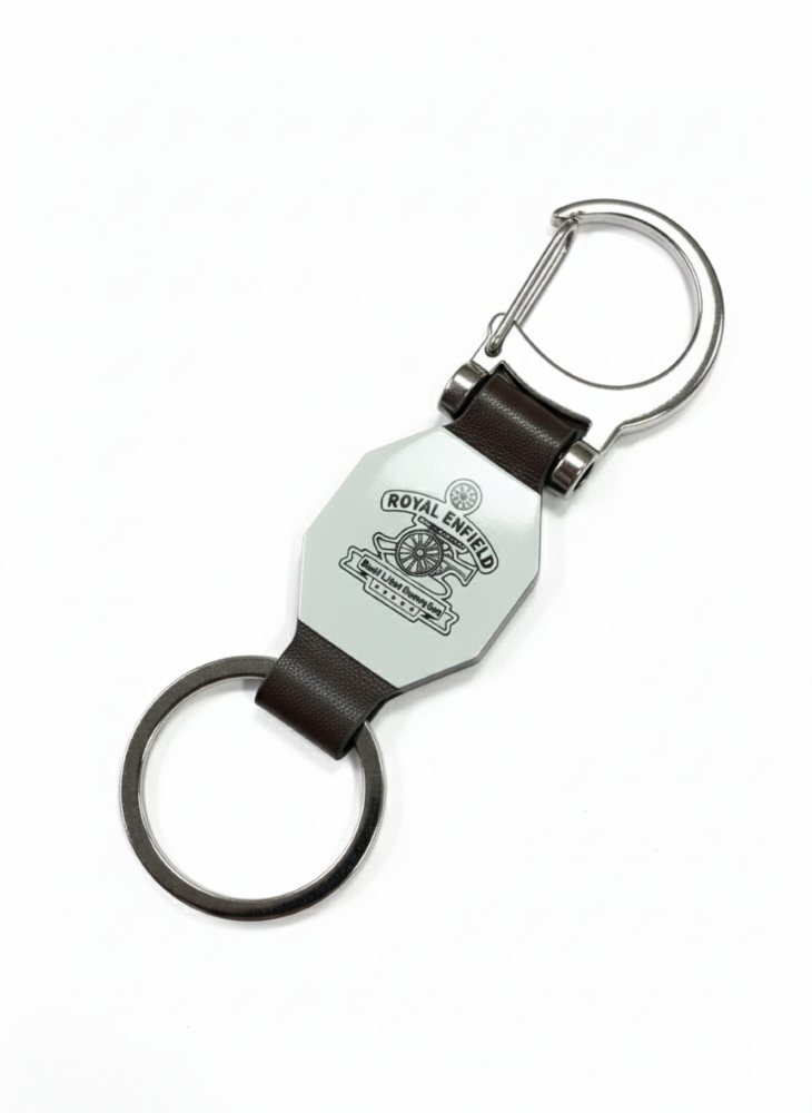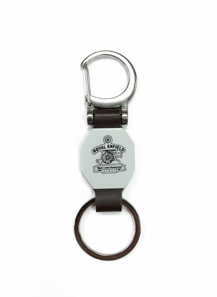 The keychain features a prominent, heavy-duty metal carabiner for reliable clipping, a rugged [Brown/Black] leather strap, and a substantial octagonal plate that proudly displays the classic Royal Enfield Cannon Logo and motto. This is the ultimate, no-nonsense accessory for securely managing your keys, designed to withstand the road ahead.