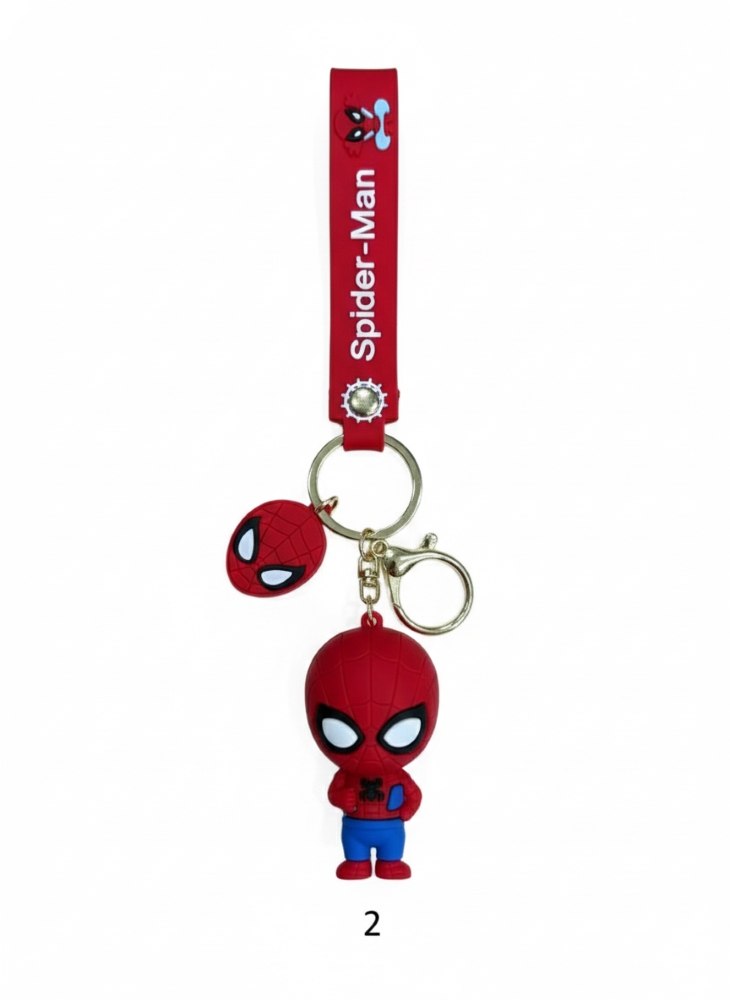 Strap/Fob: The figure is attached to a red fabric or rubber strap/fob. This strap typically features the text "Spider-Man" and a small graphic, possibly a spider or a simplified Spidey mask.