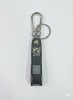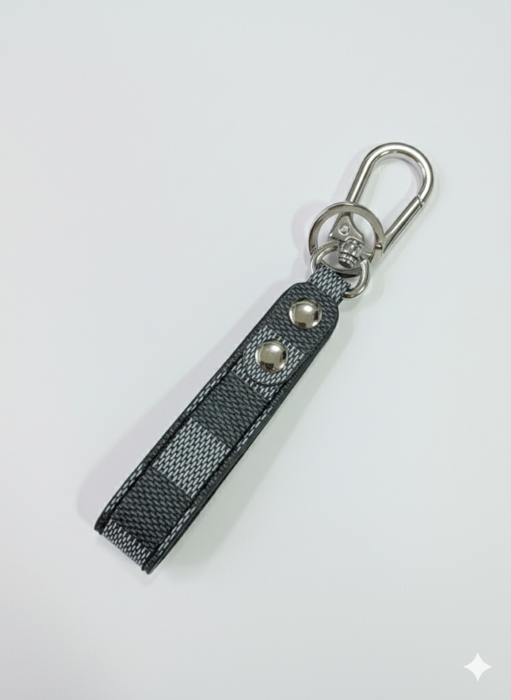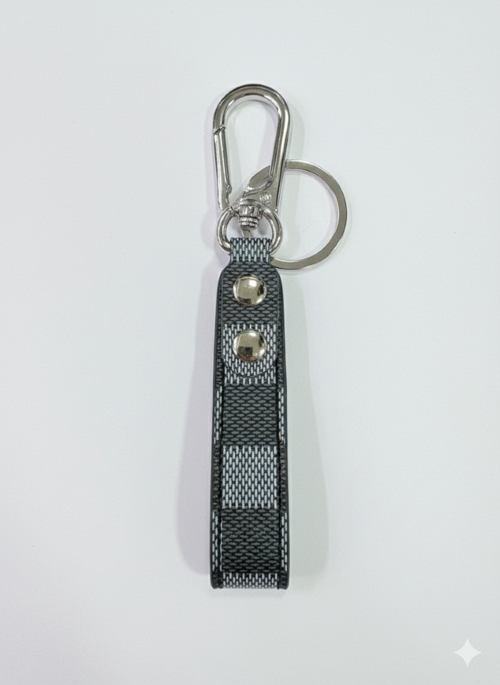 This keychain features a modern design combining a classic pattern with rugged hardware.