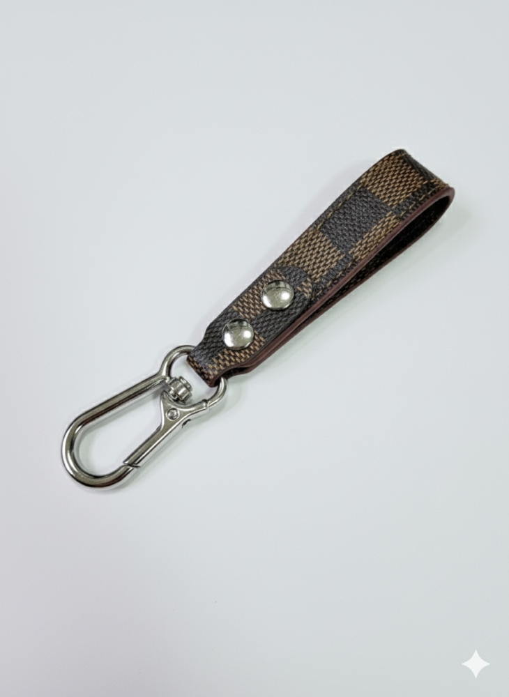 Design: It consists of a narrow, folded strap or tab made of leather or leatherette material, finished in a distinctive checkered/plaid pattern (typically a black/gray/white monochrome or a brown/tan scheme, depending on the specific color).