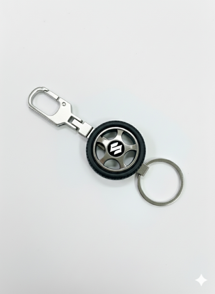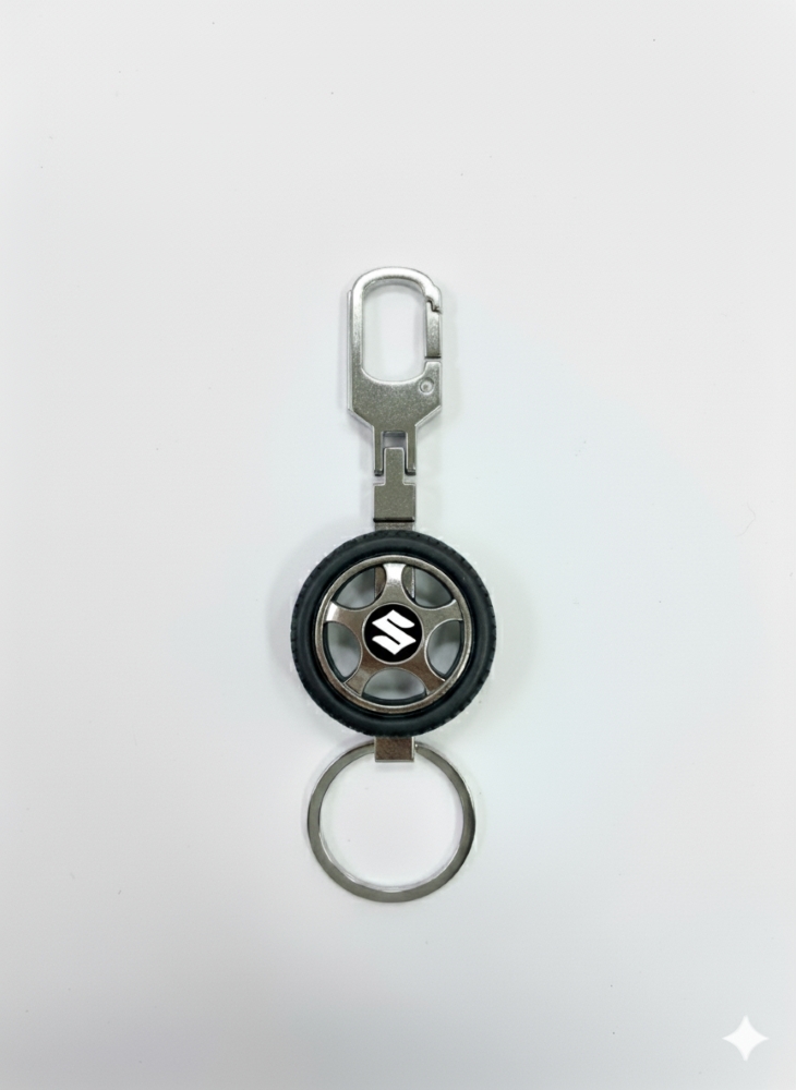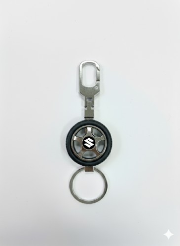 This wheel-style keychain features the prominent Suzuki logo at its center.