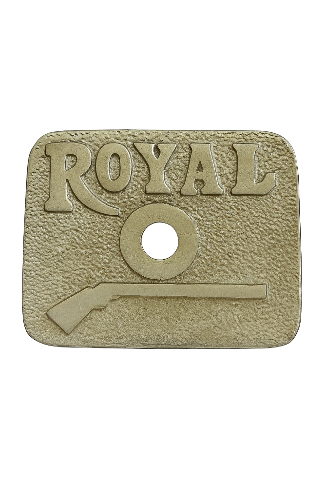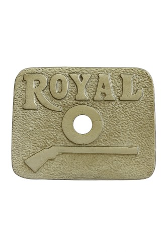 Tapped plate old chrome-plated finish, rectangular shape with embossed “ROYAL” lettering at the top, a central round hole, and a rifle design at the bottom. The surface has a slightly textured background, giving it a classic vintage look.