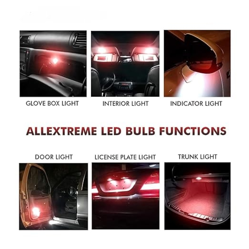 T10 LED bulbs are perfect replacements to those standard halogen bulbs that offer low brightness. These lights will fit directly into all T10 bulb size sockets such as W5W, 147, 152, 158, 159, 161, 168, 184, 192, 193, 194 and 2825. An ideal choice for use on license plate tag light, map lights, dome light, trunk cargo room lights, side door courtesy light, reading lights, glove box lights etc.FEATURES AND PERFORMANCE DETAILS:Made of LED chips for low power consumption but high light output.No extra decoder needed, just plug and play, no error after installation.Zero visual blindness. Brings you a bright and comfortable lighting experience.SPECIFICATIONS:Voltage: DC9V~16VReplace: T10Colour: RedWattage: 1WAPPLICATION AREA:Dashboard, License Plate Light, Reading Light, Dome Light, Map Light, Daytime Running Lights, Clearance Light, Back-Up Light, Brake Light, Fog Light, Turn Signal Light etc.PACKAGE INCLUDES:2 x T10 LED Bulbs