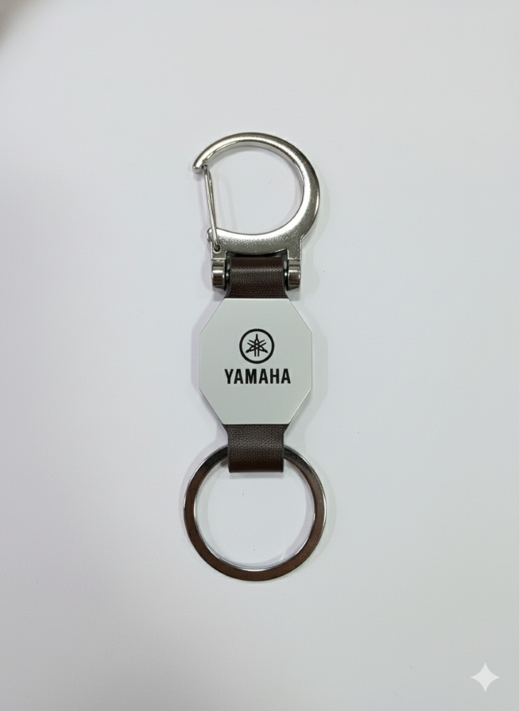 Iconic Yamaha Branding: Features the famous Yamaha Tuning Fork logo and wordmark prominently on a modern, octagonal metal fob.